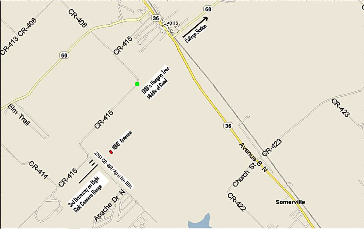TX-21 in Caldwell, go South 13.5 miles on HWY TX-36, then turn West on CR-415.